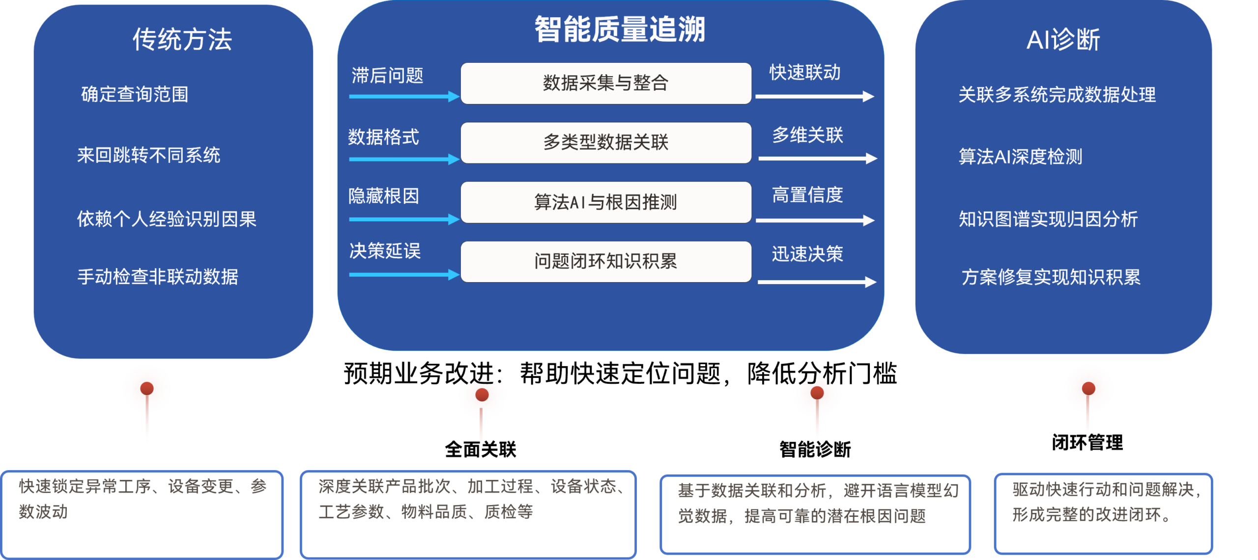 深度关联产品批次、加工过程、设备状态、工艺参数、物料品质、质检等.